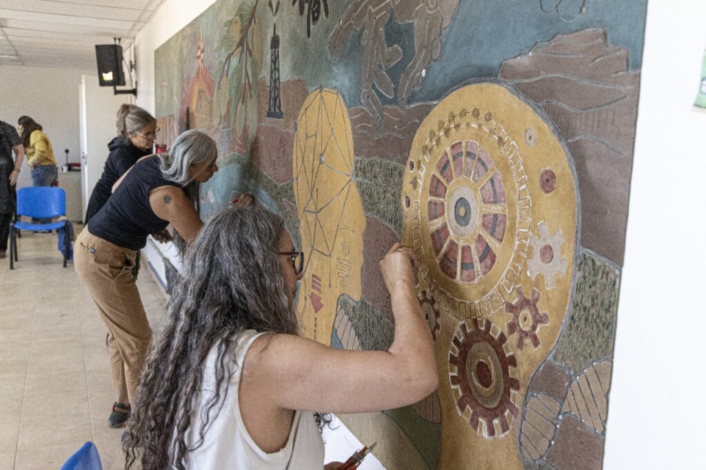 El objetivo de la actividad, estuvo orientado a que los participantes experimenten distintas técnicas de realización de murales, integrando procesos creativos, decorativos y artísticos que evidencian las propiedades de la tierra: sus ventajas, potencialidades, límites y los usos adecuados de las terminaciones naturales —como los revoques— dentro de propuestas de bioconstrucción. La capacitación puso en valor materiales no tóxicos, reciclables y ambientalmente responsables, alineados con prácticas compatibles con la salud humana y el cuidado del ambiente.